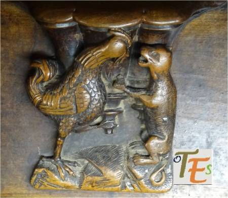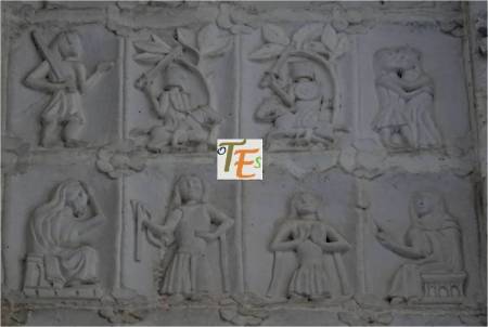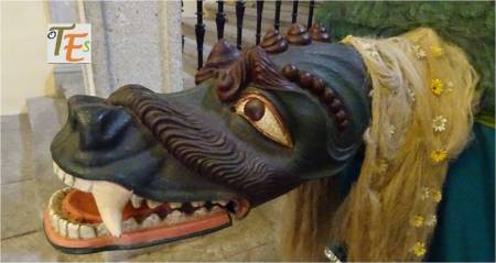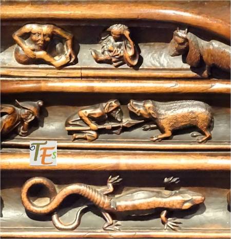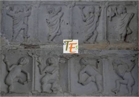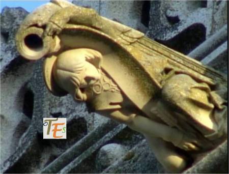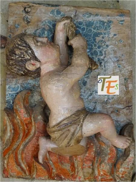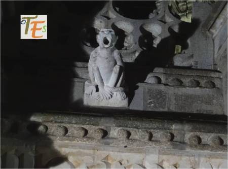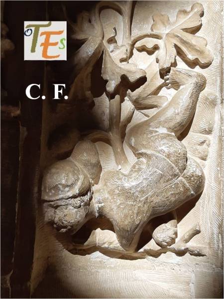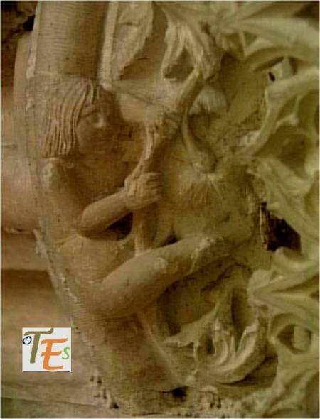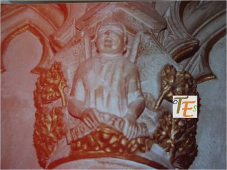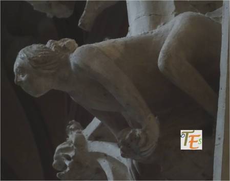 En uno de los simbólicos templos toledanos, nos encontramos esta figura en difícil contorsión, boca abajo. Por su moño, se refiere posiblemente a una de las mujeres que formaba parte de la “procesión de los locos”. De ahí que se encuentra semidesnuda, con las nalgas y el trasero al aire, ya que era una fiesta en la que eran permitidos ciertos actos lujuriosos.Aún se observa en la talla, las señales del cincel de dientes.