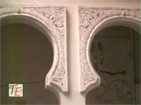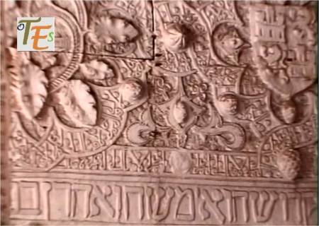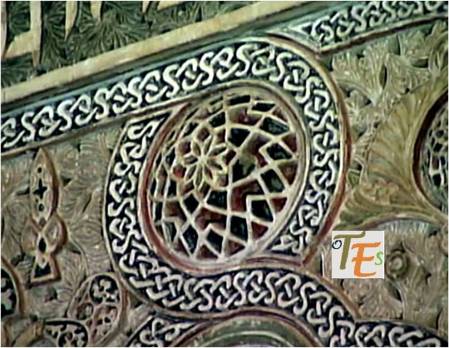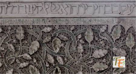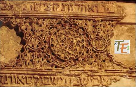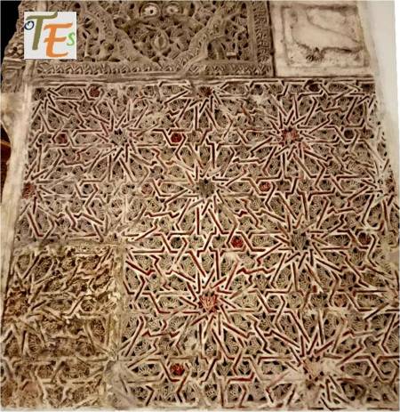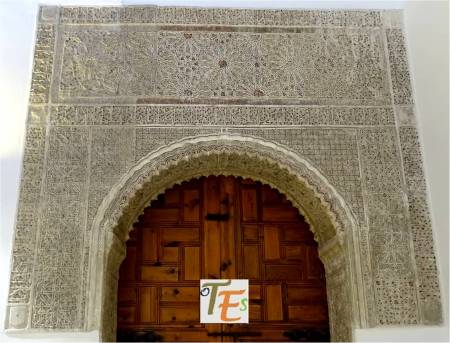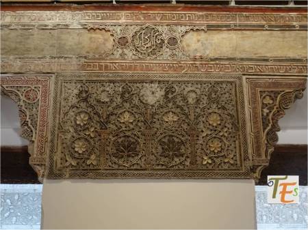 Exquisita yesería perteneciente a la galería de mujeres o matroneum hebreo, que se halla en la parte alta de la Sinagoga de Samuel Ha-leví o del tránsito, el cual parece otro templo en miniatura. En su faja central se observa el “horror Vacui”, relleno de ataurique con los lirios de Sarón y las estrellas octogonales y entre sus caracteres hebreos se lee “Y tomó la profetisa Miryam, hermana de Aarón, el adufe en sus manos diciendo, cantad a Yahveh”.