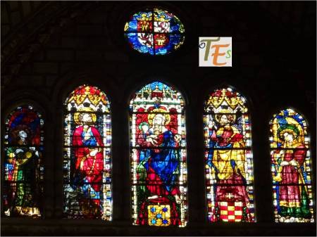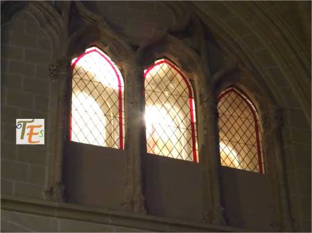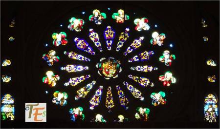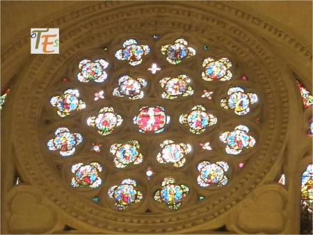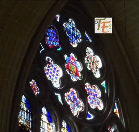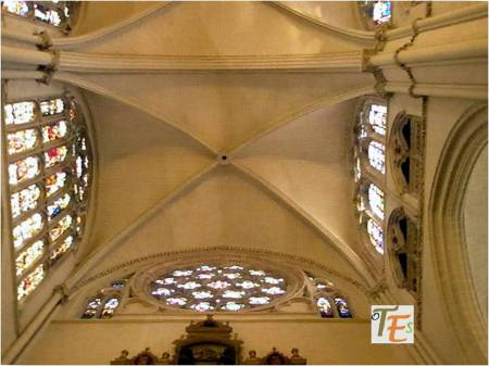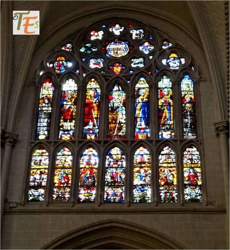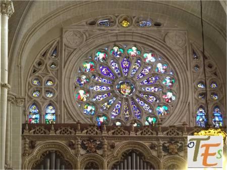 Una de los rosetones, que componen la parte superior de una de las vidrieras del templo primado toledano. En ella se ve una roseta en su centro, rodeado por seis cuadrifolios, todos rellenos de coloridos vitrales, los cuales dan una tenue luz al interior del templo.