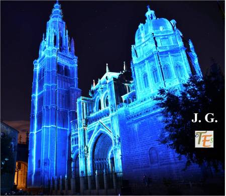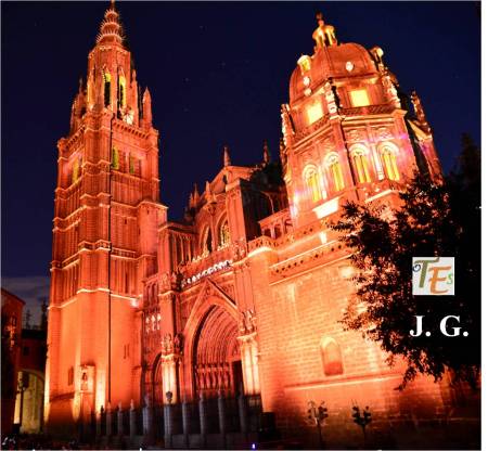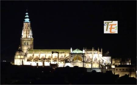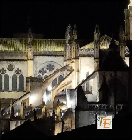 Parte de la cabecera, brazo sur del crucero, contrafuertes y arbotantes, en el exterior de la catedral de Toledo, en una visión nocturna e iluminada, para que esta sea visible desde el otro lado del Valle, recorriendo la Carretera de Circunvalación que rodea la ciudad.