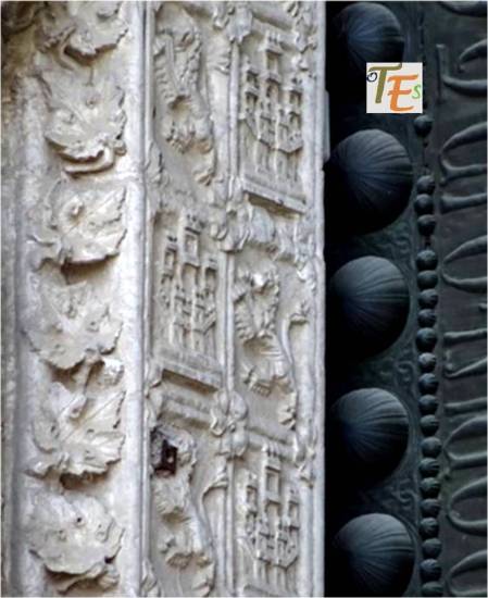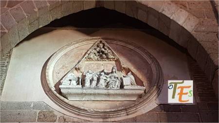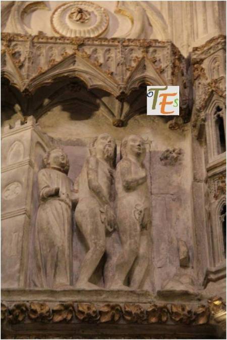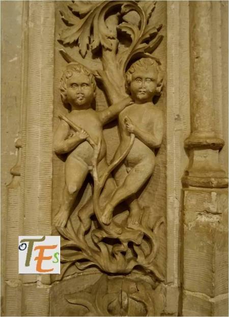 Representación del árbol del bien y del mal, con la serpiente, los frutos y la cabeza de Eva. Se encuentra esta curiosa talla, en un catafalco recordatorio, delante de la Capilla Mozárabe, para la exposición sobre el Cardenal Cisneros en 2017-18.