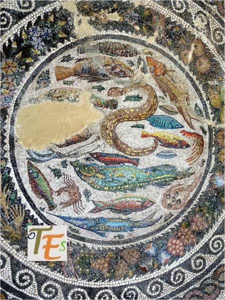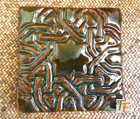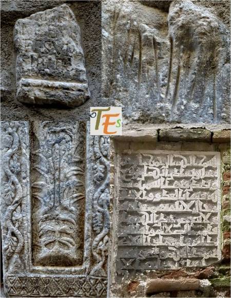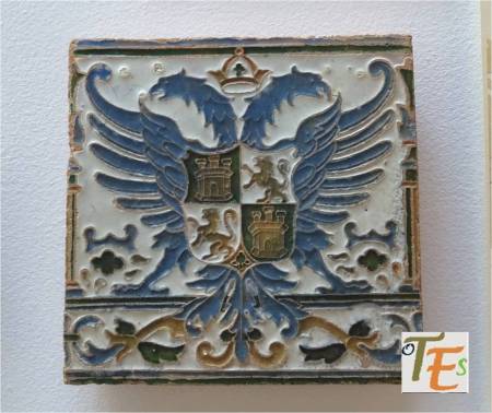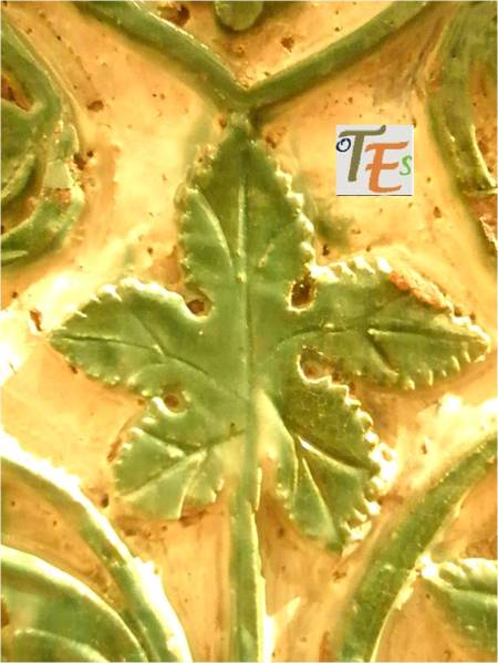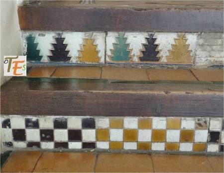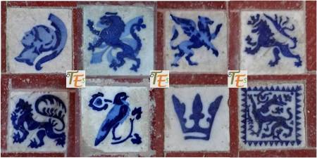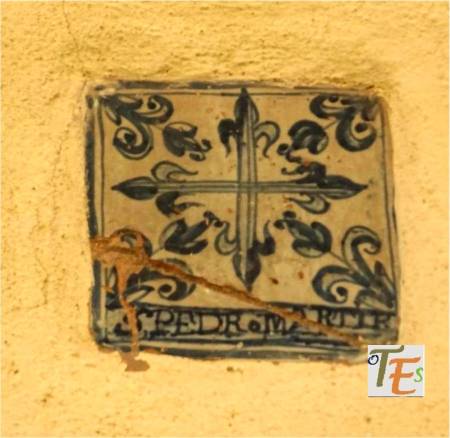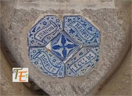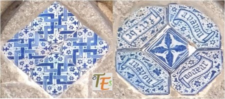 Siguiendo la fotografía anterior, dejamos aquí los dos tipos de azulejos de color azul que los componen. En el cuadrado, vemos unas bandas entrelazadas y el de forma octogonal está compuesto por una cruz central en forma de hojas y a los lados unas filacterias que contienen unos raros caracteres. En uno parece decir “fitsbe” y en los otros tres “nodear”.