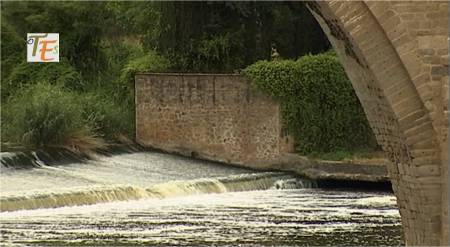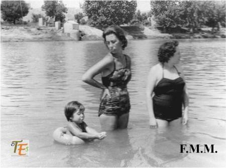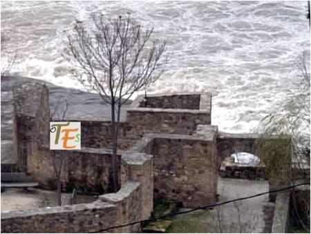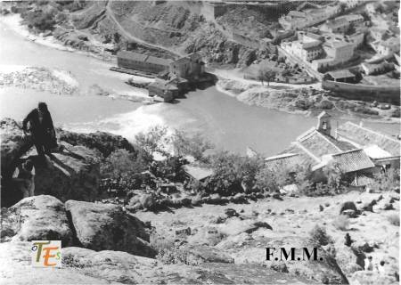 Frente a nosotros el famoso «Baño de la Cava», con su «peñón» delantero. Estos sustentaban posiblemente un puente de barcas. La torre exterior con dos alturas, para tiempos veraniegos la baja y para tiempos invernales la alta. El pilar dentro del río, está dado la vuelta por la fuerza del agua en una de sus extraordinarias crecidas.