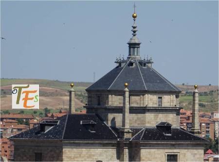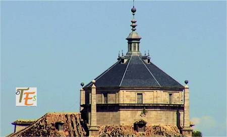 Fotografía donde podemos ver en primer término, el cupulín octogonal con su chapitel, los dos barrocos, que guardan y dan luz a la bóveda interior, en el centro del crucero del Museo de Santa Cruz. En lontananza, vemos el valle norte que baja hasta el río Tajo, el cual forma su Vega Alta.