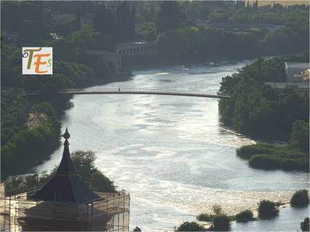 Panorámica tomada desde un torreón pegado al río Tajo, desde el que vemos la coracha de «la Cava» que baja hasta el mismo y tras esta, el arco central del puente de San Martín por donde pasan sus aguas contaminadas, con sus inseparables espumas.