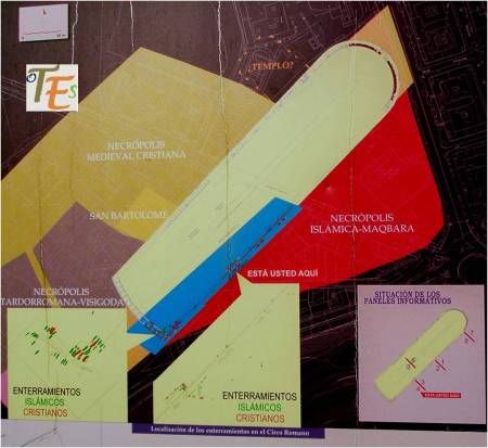 Este es el panel indicativo del Circo Romano de Toletum construido por los hispano-romanos en el siglo primero de nuestra era. En él vemos su espectacular magnitud, además de orientarnos y enseñarnos los diferentes cementerios que hubo sobre el mismo y en sus alrededores, en épocas posteriores.
