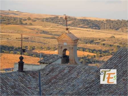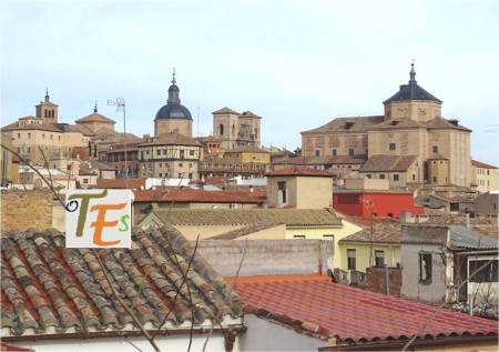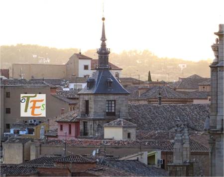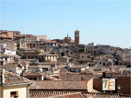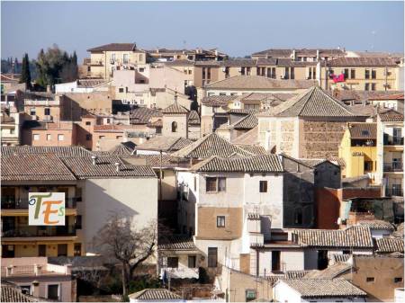 Vista parcial toledana, donde observamos su nutrido caserío y emergiendo de este, las torres que coronan los flancos del Ayuntamiento. También el edificio, el cimborrio y la espadaña de la desacralizada iglesia de San Marcos y a un lado la torre mudéjar de Santo Tomé. Todo ello en un conglomerado único.