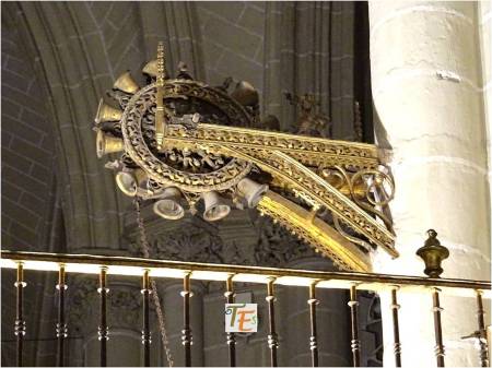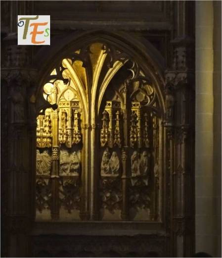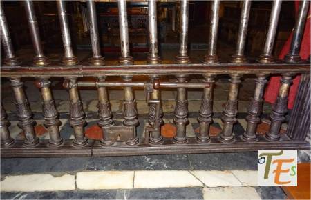 Parte alta de la reja de entrada al coro catedralicio. Considerada la mejor reja existente en el mundo, fue trabajada en hierro, cobre y latón por el maestro toledano Domingo de Céspedes y terminada en 1548 junto a su yerno Fernando Bravo. Dos preciosos candeleros platerescos en su parte central, acompañan una rodela contenedora del escudo del cardenal Silíceo.