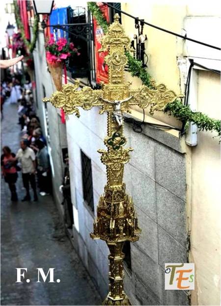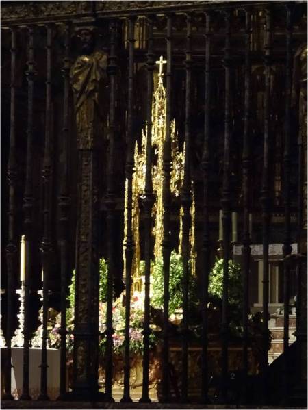La custodia del cardenal Cisneros encargada al orfebre Enrique Arfe, iluminada entre penumbras en el presbiterio catedralicio, poco antes de enseñar sus brillos, por las calles en el Corpus Christi de Toledo, fiesta grande de la ciudad.