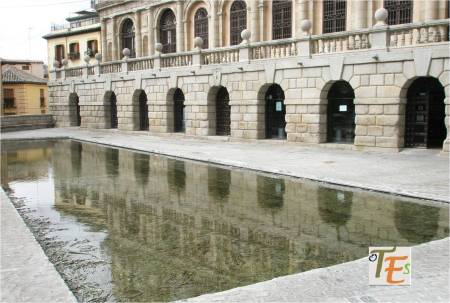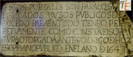 Aquí vemos el antiguo edificio de la Alóndiga toledana, donde se guardaban anteriormente toda clase de productos, entre ellos el famoso trigo toledano. A su lado la entrada de la desaparecida iglesia dedicada a la Virgen de los Desamparados, la cual bendecía este lugar. Su actual perspectiva, la podemos ver casi idéntica en el cuadro titulado «Toledo y la Tormenta» del Greco, pintado hace más de cuatro siglos.