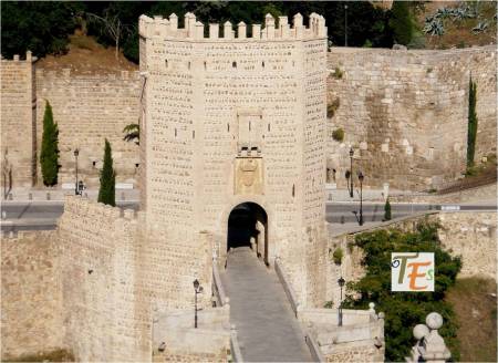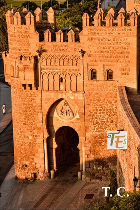 Fotografía tomada por el oriente en una de las noches toledanas, con el embrujo que ello representa. Aquí podemos decir de una puerta a otra puerta, pues al entrar por el Puente de Alcántara, nos encontramos la puerta del mismo nombre, del siglo X. Esta debía de ser inexpugnable por su entrada en codo, dando paso al adarve defensivo, que conducía a la alcazaba y al centro de la medina. Se cegó en el siglo XVI y fue redescubierta el año 1911. Increíble, pero cierto.