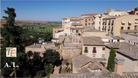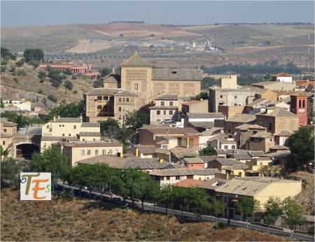 Bonita vista desde el Paseo del Miradero de Toledo, de los arrabales de la ciudad con la vega alta del río Tajo. Estos se expandieron en tiempos árabes. Uno de estos arrabales murado, se denomina como La Antequeruela y otro exterior denominado Las Covachuelas, por estar construido sobre las covachas pertenecientes al anfiteatro romano de Toletum.