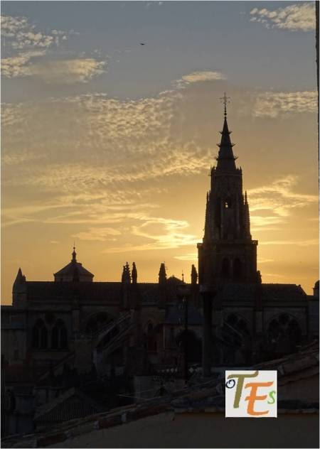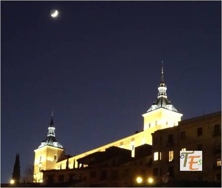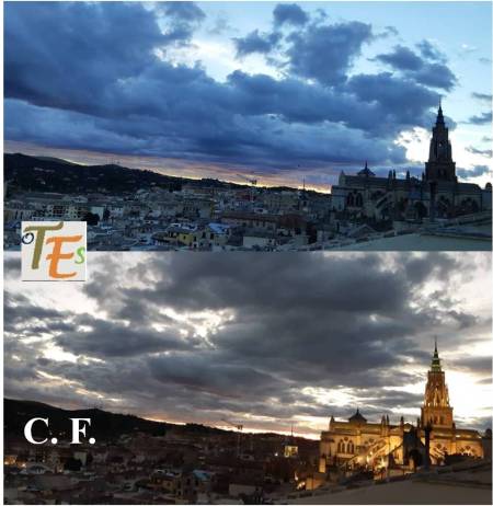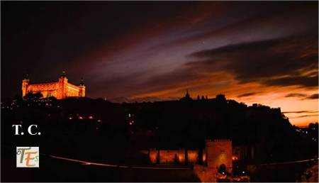 Imagen del atardecer desde la lejanía, donde vemos la torre de San Nicolás y a su lado un detalle del campanario de la torre de la Magdalena. Las dos junto al caserío toledano, se encuentran dibujadas sobre la inmensa estampa de la cara oeste del Alcázar. Esta instantánea recuerda a un daguerrotipo en blanco y negro, llevado a cabo a finales del siglo XIX por el fotógrafo Casiano Alguacil.