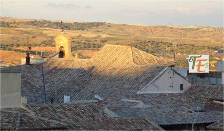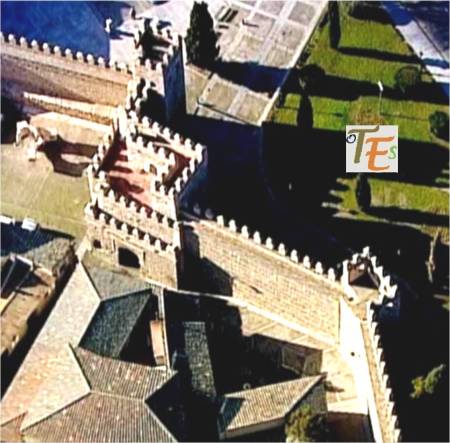 En un rosado atardecer, vemos las almenas y una alta torre que contiene la escalera que da paso a un alto torreón defensivo. Pertenece al hoy Palacio de la Cava, que anteriormente fue de los duques de Maqueda.
