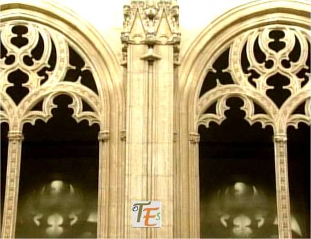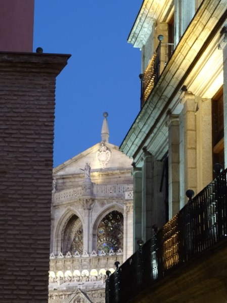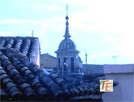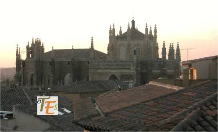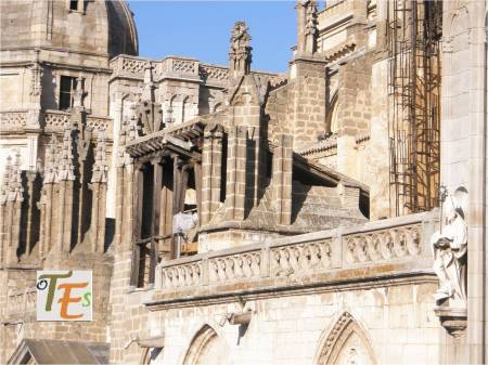 En esta vista podemos ver la parte alta de la cerería catedralicia y la percha donde se colgaban los cirios, para que estos se secaran. Por encima unos rascacielos aglutinados sin orden ni concierto en mala hora construidos, pues quitan el encanto de una ciudad gótica y renacentista de primer orden. Por encima de todos ellos sobresaliendo, el Palacio Imperial toledano, al cual denominamos como el Alcázar.