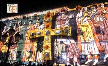Fotografía nocturna del medallón que se encuentra en el arco de entrada de la Puerta del Sol y de la Luna, uno de los pasos medievales al interior de la cuidad de Toledo. Dentro de un círculo observamos un triángulo, donde se encuentran talladas las figuras que componen la imposición de la casulla por la Virgen María a nuestro patrón San Ildefonso. Como testigos, los dos astros nombrados.