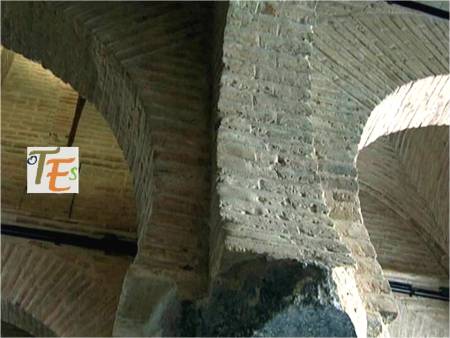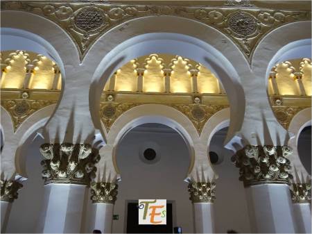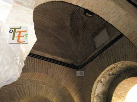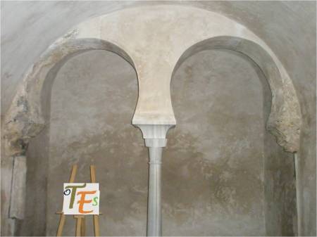 Arranque de los cuatro arcos de herradura, que sustentan las diferentes bóvedas de la Mezquita de Tornerías en Toledo. Dicha sala de oración, se encuentra elevada sobre lo que parece parte de un palacio o iglesia visigoda.