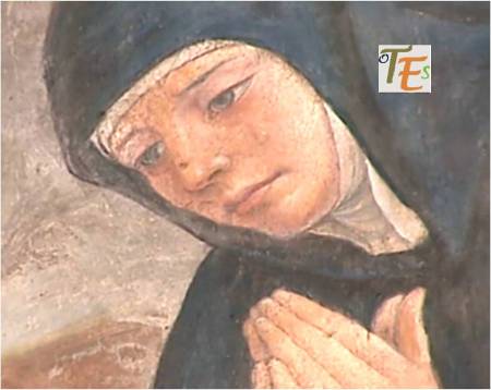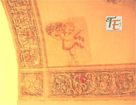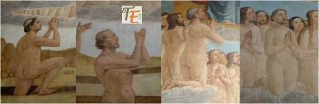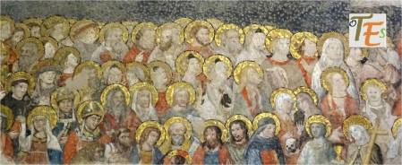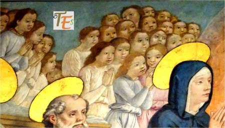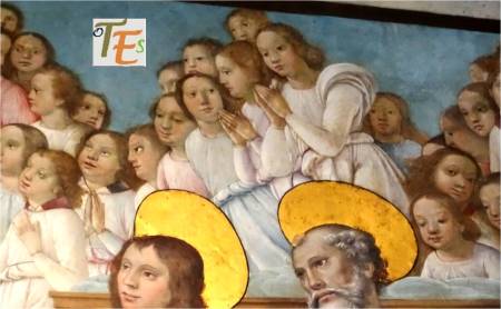 Detalle de la zona izquierda del Juicio Final, en la Sala Cisneriana pintada al fresco por Juan de Borgoña, donde observamos con sus halos de santidad a los apóstoles Juan y Santiago y por encima un coro de niños vestidos de blanco, con diferentes y bellas caras, posiblemente inspirados en los “seises cantores” de la catedral, como ya comentamos más arriba.