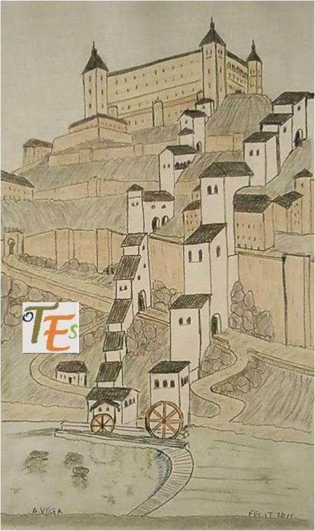 Dibujo del posible segundo artificio, que tuvo que fabricar el relojero Juanelo Turriano, al quedarse el Palacio Imperial todo el agua que este elevaba y no ser retribuido parte de su coste tanto por los militares del rey como por el Ayuntamiento, al no recibir la ciudad el líquido elemento del río Tajo.