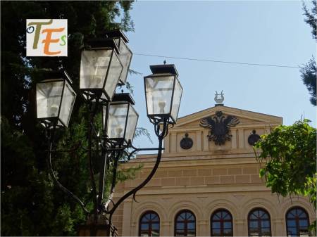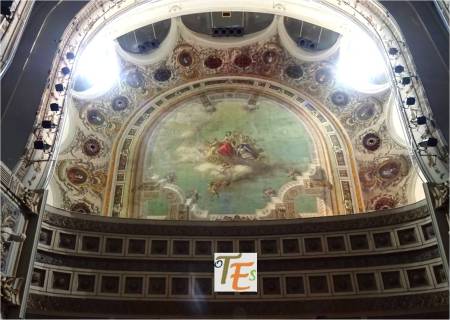 Inaugurado en el año 1878, el espectacular Teatro de Rojas contiene obras verdaderamente extraordinarias. En la instantánea vemos su techumbre pintada al fresco, por el pintor Juan Espantaleón, entre otros donde observamos un cielo con nubes y en su centro rodeada de ángeles Talía, la musa del teatro.