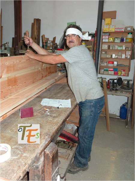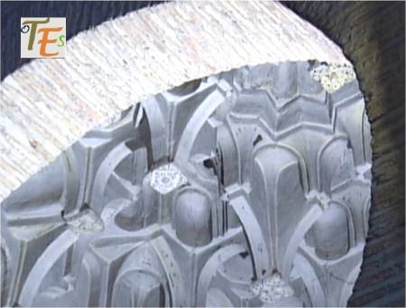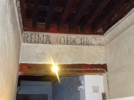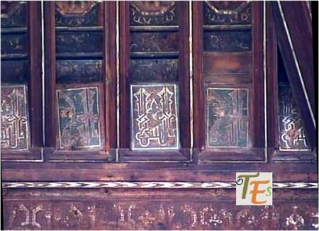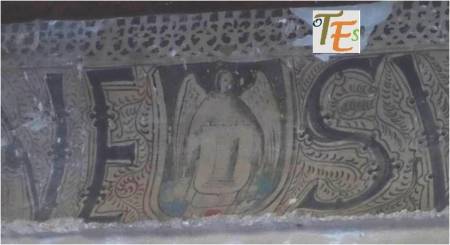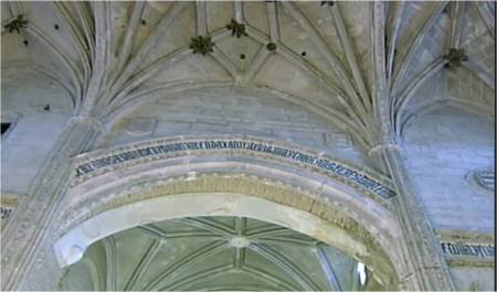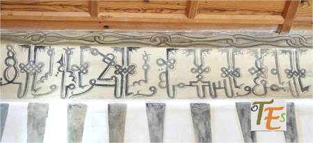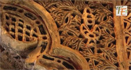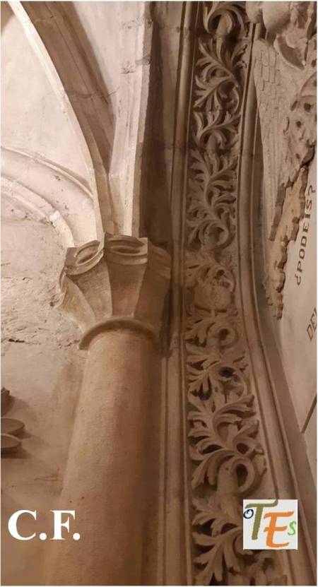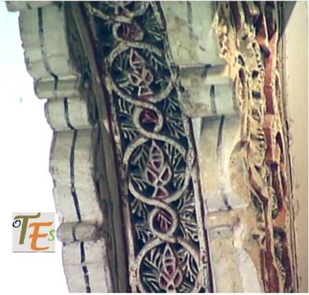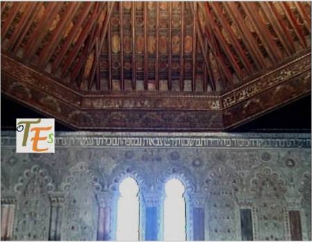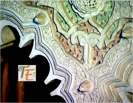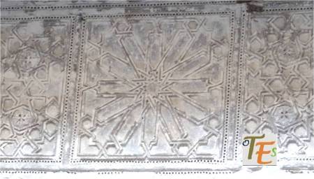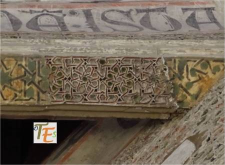 En un mismo edificio toledano del siglo XIV, nos podemos encontrar sorpresas como esta. Por encina observamos el detalle de una banda con letras epigráficas góticas, donde está escrito el Apocalipsis de San Juan. Se sustentan sobre una viga, donde vemos a los lados pinturas mudéjares, que sirve de modelo para el pegado sobre ella del ataurique en estuco, el cual la dará su toque último, embelleciéndola.