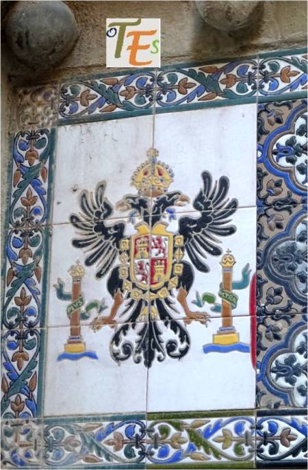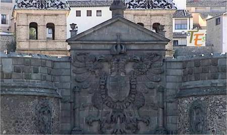 Escudo exterior que preside la Puerta del Cambrón al Oeste de la ciudad de Toledo. Al ser reconstruida en 1576 en tiempos de Felipe II, se dejó el águila de una sola cabeza y el escudo de León y Castilla, pero se le adosó lógicamente el Collar con el Vellocino de Oro, flanqueándole las dos figuras sedentes de los reyes godos.