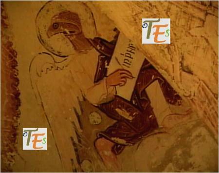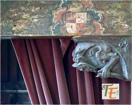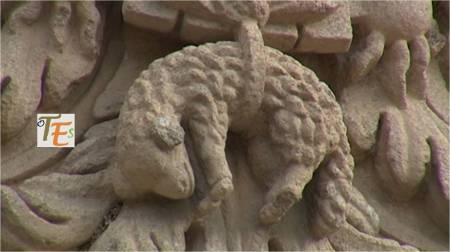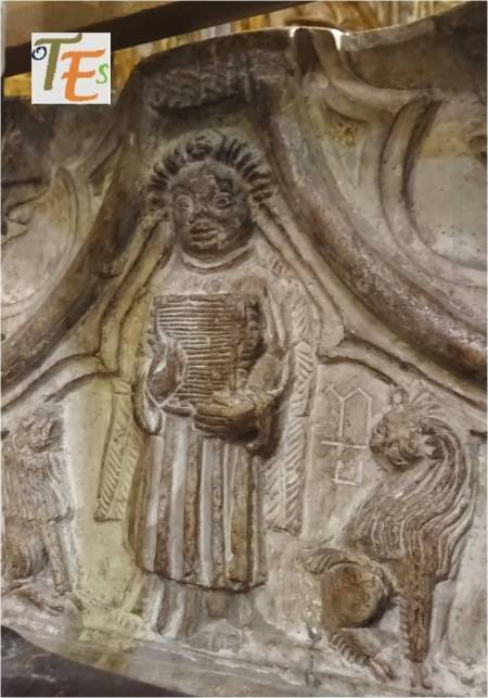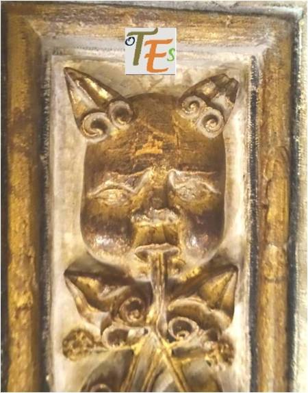 Ángel búdico tallado en la catedral de Toledo, según su rostro. Este contiene un enigma, pues pese a tener entre sus manos una de las páginas del Evangelio, en su pelo observamos una “flor de loto”. Otra curiosidad más la vemos a ambos lados del mismo, por los dos perrillos tallados, representando a la raza “Lapsa Apso”, que eran los que guardaban los tesoros de las lamaserías en el Tíbet.