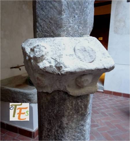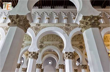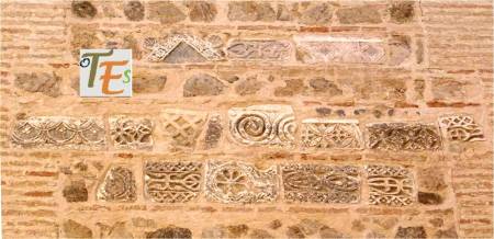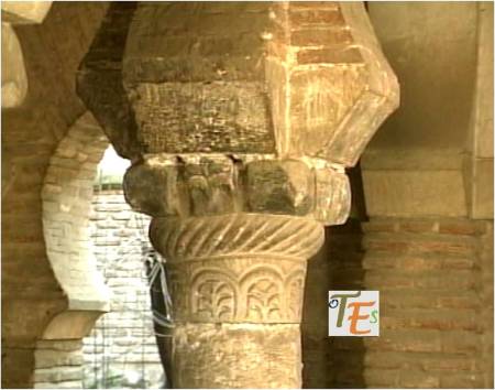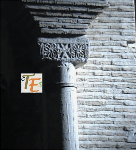 Uno de los capiteles islámicos, obra en mármol con desgastadas volutas y trabajado en nido de abeja, el cual se encuentra sustentando el arco de uno de los pórticos mudéjares toledanos.