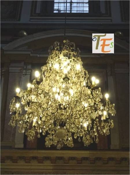 Instantánea desde la línea de proscenio, perteneciente al Teatro de Rojas en Toledo. Desde donde vemos el patio de butacas o platea. A más altura los palcos de platea y por encima los dos pisos superiores o balcones con sus palcos y en la parte superior el balcón general. En este interior, observamos la herradura o concha acústica para una buena audición.