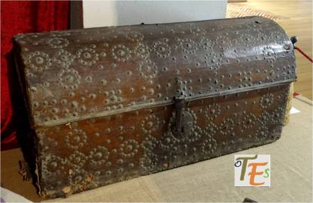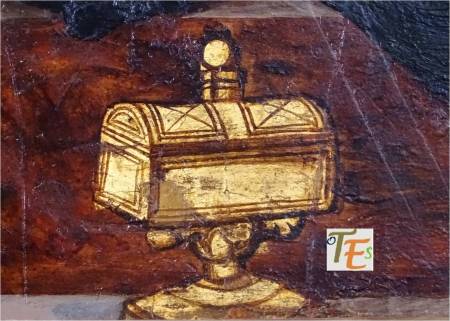 Curioso copón con forma de baúl, para contener las hostias consagradas. Fue pintado por el pintor toledano Francisco Comontes, discípulo de Juan de Borgoña, para el retablo del desaparecido convento de franciscanas de Santa Ana en Toledo. Parte de este se encuentra en el Museo de Santa Cruz, de esta ciudad.