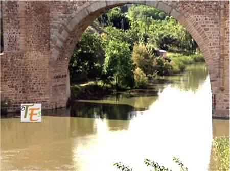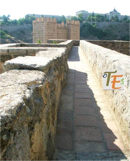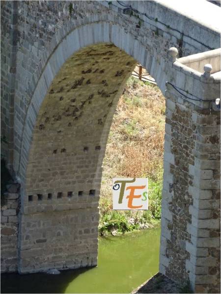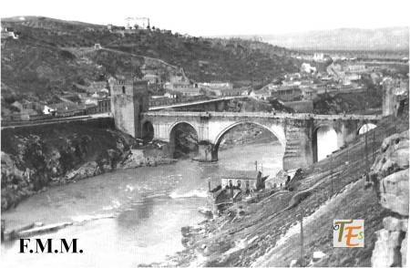 El bello ojo central del Puente de Alcántara en Toledo, que fue construido en tiempos romanos, teniendo veintiséis metros de luz y ahí sigue haciendo su función, después de casi dos mil años.