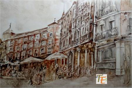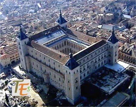 Perspectiva hacia el norte de Toledo, desde la puerta principal del Alcázar. En ella apreciamos la parte alta del Museo de Santa Cruz y a su lado derecho según miramos, la entrada del río Tajo a la ciudad.