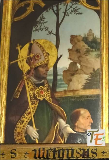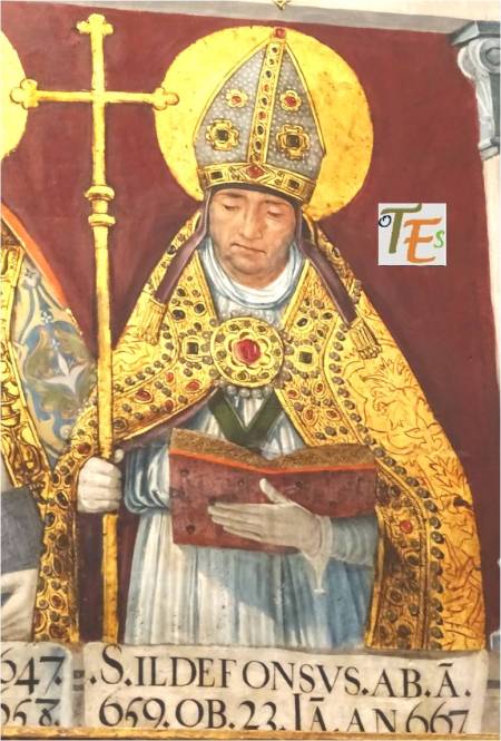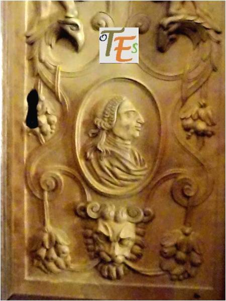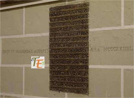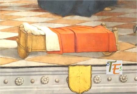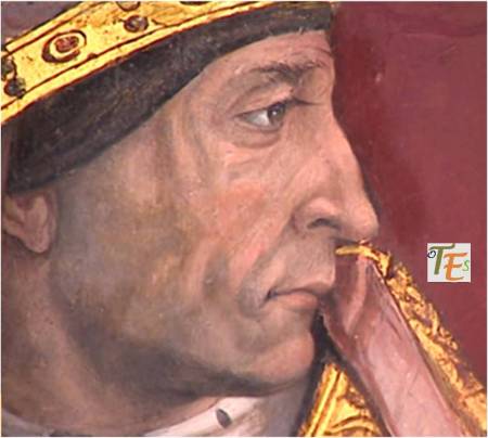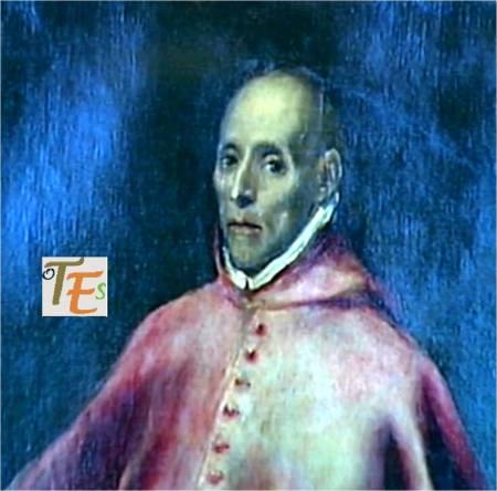 Pintura de perfil del rostro del cardenal y arzobispo de Toledo Francisco Jiménez de Cisneros. Ejecutado por Juan de Borgoña en la sala capitular de la catedral de Toledo, detalle que demuestra la gran personalidad de este prelado. A este le debemos la construcción del claustro alto, la capilla mozárabe, la restitución del rito toledano ante la iglesia de Roma, la propia sala capitular, la ampliación del presbiterio en su forma original, el retablo del altar mayor, la capilla baja del sepulcro y la joya entre las joyas mundiales, la custodia de Enrique de Arfe. Con estas fábricas, obras y objetos sagrados, amplió y enriqueció hasta los límites más altos de su tiempo, a la “Dives Toletana”.