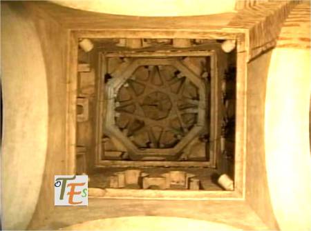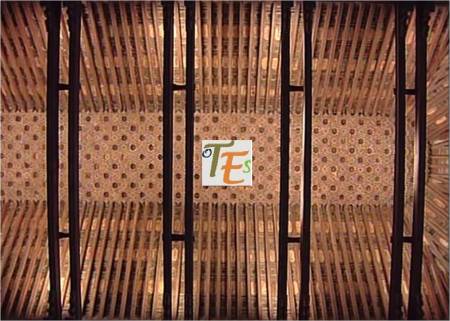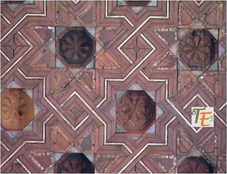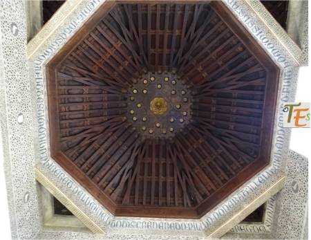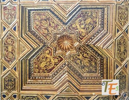 Estructura de par y nudillo en el artesonado en madera, de una de las alcobas del palacio mudéjar del Taller del Moro, rematado en el centro con una forma octogonal con mocárabes, más la piña central de la inmortalidad. Se sustentan sus ocho lados con una faja en latín, donde está escrito el Apocalipsis. Detalle que forma parte de otra de las joyas secretas que guarda Toledo.