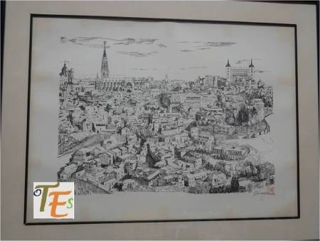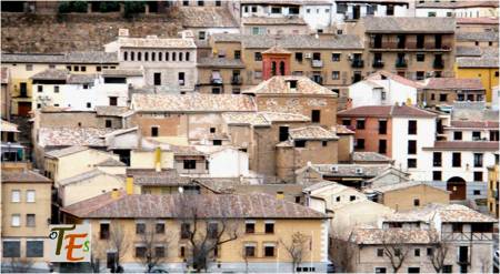 Paisaje del laberíntico conglomerado de casas y edificios toledanos. Aunque si nos fijamos un poco, en él podemos observar la galería y torreón restaurados, del convento de San Juan de la Penitencia, que fue fundado en 1514 por el Cardenal Cisneros. A un lado la torre-alminar de San Lorenzo, edificios destruidos en 1936. Debajo el Convento de las Jerónimas de San Pablo, fundado por Dª María García a principios del siglo XV.