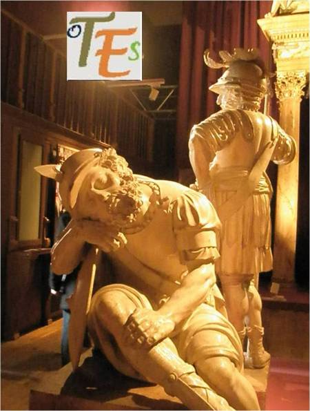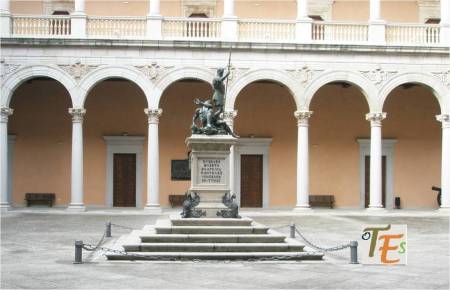 Patio imperial de armas del Alcázar de Toledo, con columnas toscanas, en cuyo centro se exhibe una copia de la estatua en bronce de Carlos V, personificando al dominio del furor turco. La original le fue contratada al escultor de Milán, Leone Leoni en el año 1549, siendo de una gran perfección técnica anatómicamente. La terminó su hijo Pompeo Leoni en 1564, trabajando ya para su hijo Felipe II.