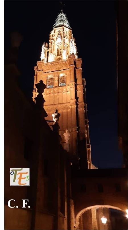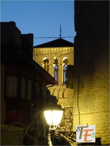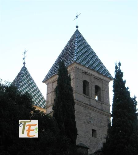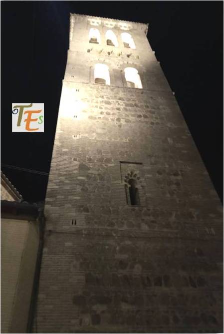 Vista nocturna de la austera pero bella torre mudéjar, perteneciente a la iglesia latina de Santo Tomé o Tomás apóstol, reconstruida en el siglo XIV por el señor de Orgaz sobre una mezquita musulmana. Por encima del alminar a la que pertenecía, se erigió su campanario cristiano.