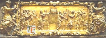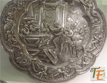 Preciosa bandeja repujada en plata, en estilo renacentista, por el orfebre Matías Menlic en el siglo XVI, para el rico tesoro de la catedral toledana. Su bella escena se refiere al Juicio de Filotas, por su complot contra Alejandro Magno.