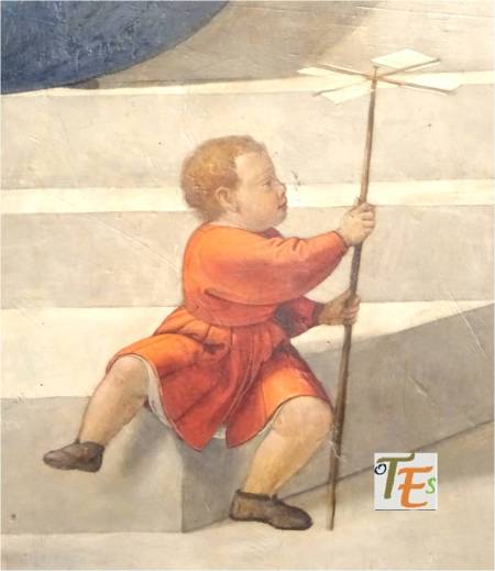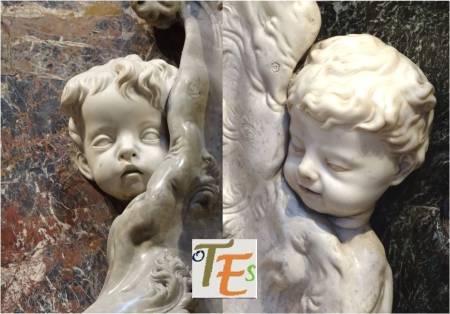 Entre delicados jaspes y nubes grisáceas, aparecen las extraordinarias tallas de dos cabezas blancas en mármol de Carrara, pertenecientes a unos “putis” o angelotes, que se encuentran componiendo el delicado monumento barroco del Transparente. Las dos aparecen tras sus respectivos nimbos, considerando estar jugando al “veo, veo”. Su naturalidad habla por sí misma.