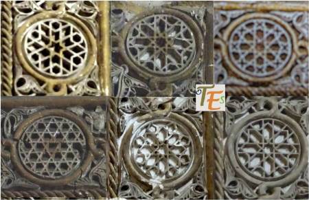 Observamos aquí seis primorosos círculos, pertenecientes al estilo mudéjar toledano. En ellos vemos sus diferentes y espectaculares formas geométricas. Unos formados con octógonos y otros con hexágonos, cuyas combinaciones por medio de azafates y luceros, nos dejan perplejos al estudiarlos en profundidad.