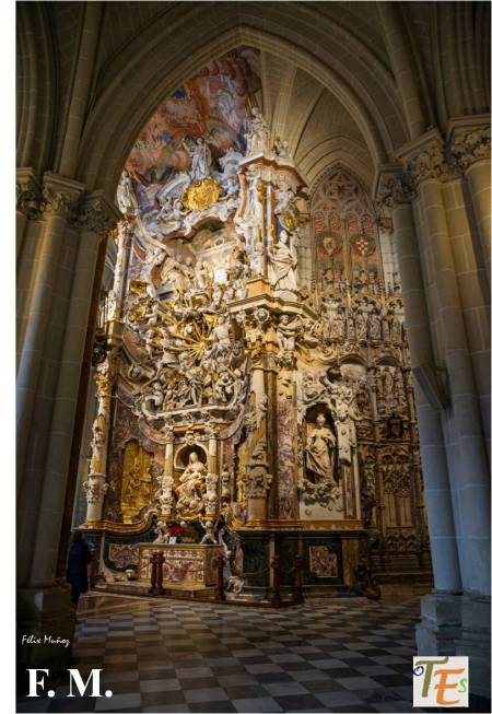 En esta instantánea, podemos apreciar la famosa y descomunal fábrica del Transparente, que se encuentra en la parte oriental exterior del presbiterio de la catedral toledana. Fue obra del arquitecto e imaginero Narciso Tomé, que acompañado por su familia, la diseño, la esculpió y la pintó, en tiempos del arzobispo Diego de Astorga y Céspedes, entre los años 1729 y 1732. Obra barroca que determina la gloria, conteniendo a personajes y profetas del Antiguo Testamento, llegando hasta las visiones del Apocalípsis de San Juan.