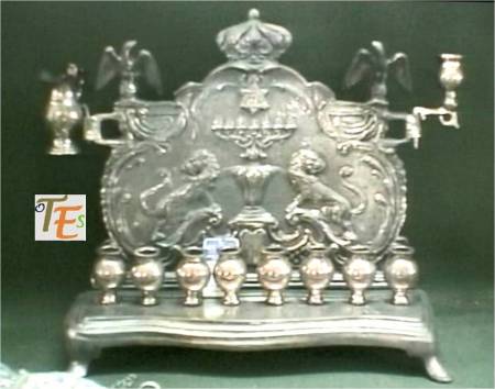 Aquí observamos una repisa en plata, contenedora de ocho pequeños recipientes más el testigo, para recibir el aceite e iluminar sus lamparillas en la fiesta hebrea de Janucá. También se la conoce como fiesta de las Luces y pese a conmemorar la reedificación del Segundo Templo de Jerusalén, se celebra en tiempos de Navidad y por tanto en el Solsticio de Invierno. Esta joya se encuentra en un comercio de anticuario toledano.
