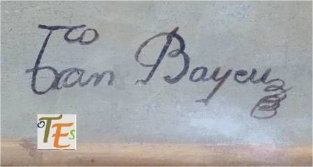 Firma del pintor Francisco Bayeu, en los frescos pintados en el claustro de la catedral toledana, los cuales se encuentran muy deteriorados por las humedades y la intemperie. Fueron pintados en estilo barrocos, entre 1776 y 1782, sobre otras pinturas más antiguas.