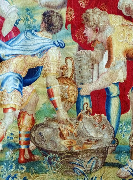 Entre la riquísima colección de tapices flamencos, de la catedral toledana, observamos un detalle bíblico. La escena se refiere al recogimiento del tesoro, descubierto en el saco de Benjamín, el último hijo de Jacob según el Génesis 43:1 y 44:34. Por dicho motivo fue conducido ante su hermano José, el cual había sido traicionado por sus hermanos. De la tribu de Benjamín, salió el apóstol San Pablo.