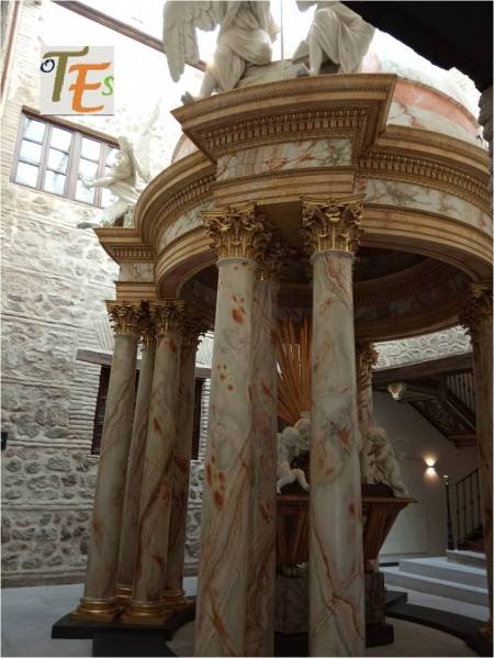 Aquí podemos ver el templete superior, que remataba la parte alta del “monumento grande” que se colocaba a los pies del templo catedral desde 1807, para semana santa. Fue diseñado y construido por el arquitecto ilustrado Ignacio Hann, en madera simulando jaspes. En su interior, una urna con ángeles guardaban la sagrada forma, siendo tallados por José Tolch.