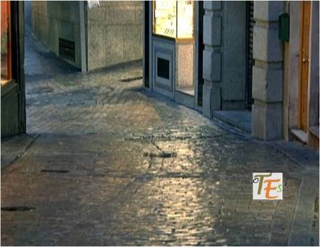 Tras una fuerte lluvia, se observa el suelo brillante y limpio de una calle toledana. Me refiero a la Bajada del Corral de Dº Diego.