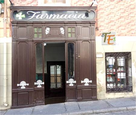 Antigua entrada a una farmacia toledana, en estilo “art decó”, que aún podemos ver en la calle Cardenal Lorenzana, estando aún en uso, dando servicio a la ciudad.