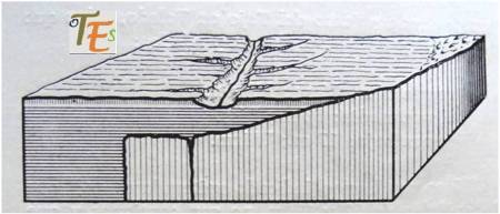 En ella vemos una falla, por la cual y a través del espacio tiempo, el entonces impetuoso río Tajo debido a las grandes crecidas tras las glaciaciones y otros accidentes naturales, fue tallando la dura roca de granito, abriéndose paso y conformando el monte en el que se asentaría la ciudad de Toledo.