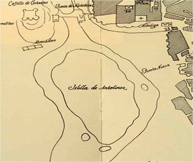 Era entonces cuando el río Tajo tenía dos brazos o cauces, formando parte de su vega alta, antes de su entrada a Toledo por dicho puente, originando la que se llamaba entonces como la Isla de Antolínez, según la vemos dibujada por Vivancos inspirado en el Plano y Vista de Toledo del Greco.