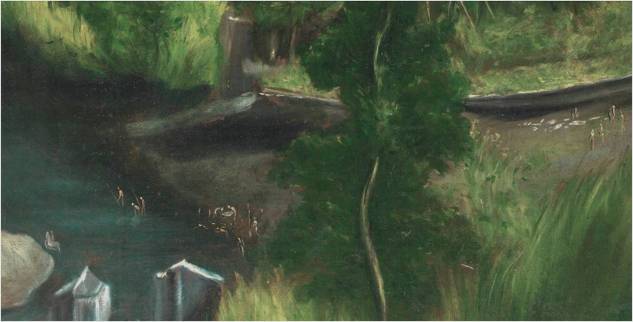 En uno de sus detalles observamos el cauce de la izquierda, entrando el río recto hacia la ciudad, donde el artista nos pinta los molinos de Pedro Pérez, posteriormente presa del Corregidor y donde vemos a gentes lavando en su lado derecho, a unos pescadores metidos en el río y otro vadeándole a caballo, llegado a la pequeña isla que se formaba en tiempos de verano y que la mayoría de nosotros la hemos conocido a nuestra temprana edad en tiempos veraniegos.